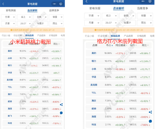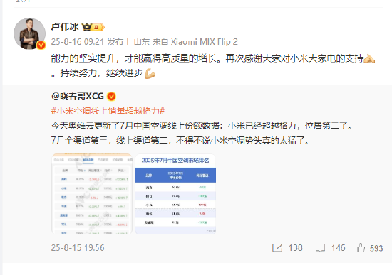 在8月15日、16日,小米高管卢伟冰、王化先后转发了奥维云网数据#小米空调线上销量超越格力#的消息。