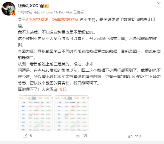 可以看到,卢伟冰微博转发别人的截图中,小米空调线上销售市占率16.71%,高于格力的15.22%。但朱磊查询的数据显示,格力的市占率16.41%,远高于小米的13.5%。