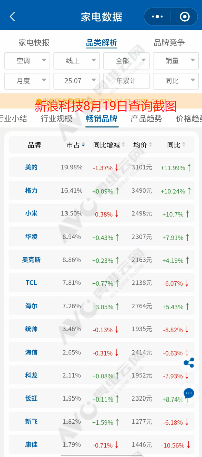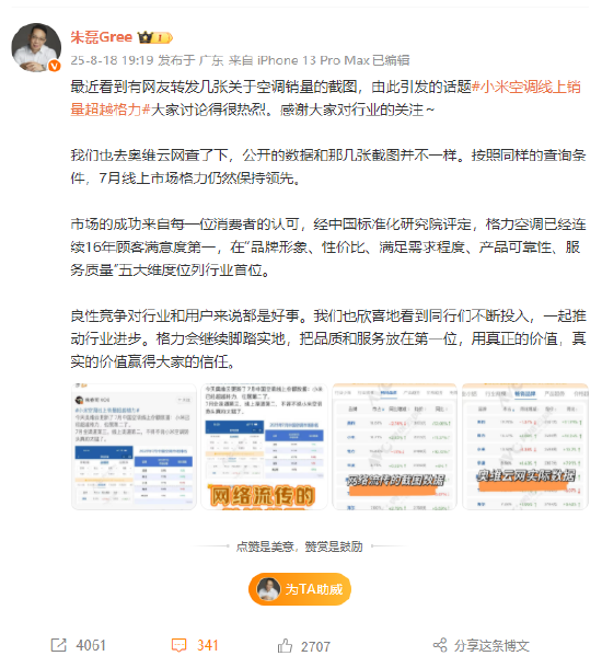 对此,格力高管坐不住了。8月18日晚恒瑞盈,格力电器市场总监朱磊在微博回应小米空调线上销量超越格力#称,据奥维云网数据,7月格力空调在线上市场仍然领先小米。