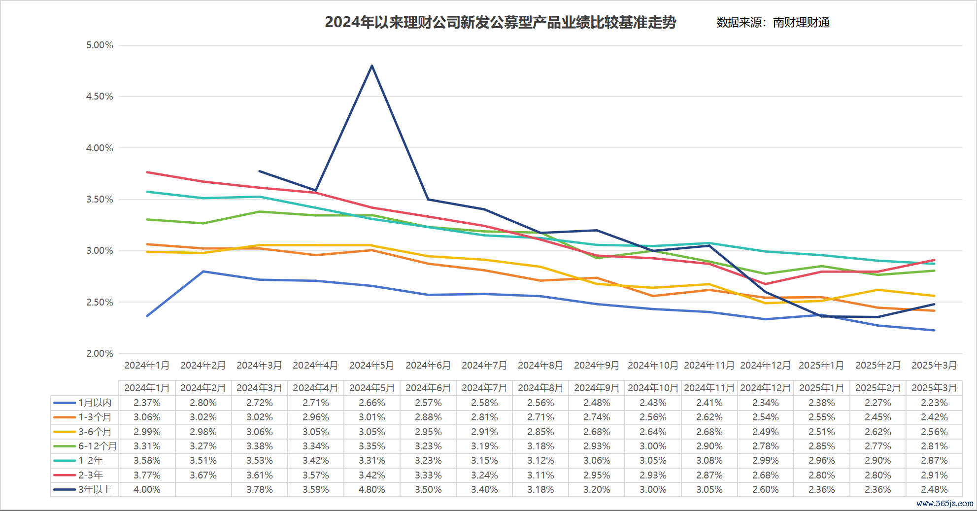 从不同期限产品看,1月以内、1—3月、1—2年期限产品定价均在2025年3月份达到最低点,环比2024年末的业绩比较基准跌超0.1个百分点。3—6月、6—12月、2—3年期限产品定价最低点出现在2024年末,2025年初有所上行。3年以上期限产品定价在2024年末跌破3%,2025年3月末为2.48%。